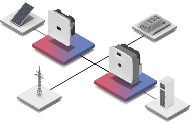 Wechselrichter spielen eine wichtige Rolle im Betrieb einer Photovoltaikanlage: PV-Anlagen liefern Gleichstrom (DC), der für die Nutzung in Haushalten, Gewerbe und Industrie sowie zur Einspeisung in das öffentliche Stromnetz zuerst in Wechselstrom (AC) umgewandelt werden muss. Diese Aufgabe übernehmen Solar-Wechselrichter. Derselbe Umwandlungsprozess ist auch erforderlich, wenn aus einem Energiespeicher Strom entnommen wird. Denn in einer Batterie wird die Energie in Form von Gleichstrom zwischengespeichert. Der Batterie-Wechselrichter wandelt diese Energie wieder in Wechselstrom um.