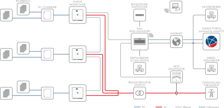Jedes einzelne Gerät kann über eine zuverlässige, schnelle Ethernet-Kommunikation zwischen Data Manager und Wechselrichter direkt gesteuert werden. Die Überwachung des gesamten Anlagenportfolios erfolgt zentral über das neue Sunny Portal powered by ennexOS. Auch Konfigurationsänderungen über verschiedene Anlagen hinweg sind problemlos möglich, ohne mehrere VPN-Verbindungen zu nutzen. Zusätzliche Überwachungssysteme können über die offene Modbus / TCP-Schnittstelle des Systems auf alle Geräte zugreifen.