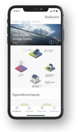 Mit der SMA Energy App haben Anlagenbetreiber alle wichtigen Daten ihres SMA Energy Systems übersichtlich parat. Sie können die Energieflüsse ihres Haushalts über Sunny Portal intelligent steuern oder ihr Elektrofahrzeug laden – nachhaltig mit eigenem Solartstrom oder besonders schnell, wenn es drauf ankommt.