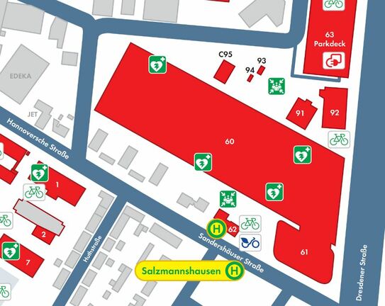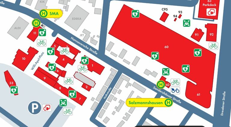 Folgen Sie den weißen Pfeilen im Plan. Sie gelangen so zum SMA Parkdeck (Mündener Straße 2, 34123 Kassel). Folgen Sie von dort aus zu Fuß den blauen Pfeilen im Plan in Richtung „Corporate Functions“. Sie erreichen uns über den Eingang des Gebäudes 60.
