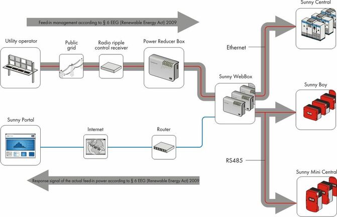 Die SMA Power Reducer Box erhält das digital codierte Signal des Netzbetreibers z. B. über einen Funk-Rundsteuerempfänger und übersetzt es in einen Steuerbefehl für die per LAN angebundene Sunny WebBox. Diese sendet den Befehl dann über den jeweiligen Feldbus (LAN oder RS485) an alle angeschlossenen Wechselrichter. Jeder Schaltvorgang wird dabei sowohl in der Power Reducer Box als auch in der Sunny WebBox protokolliert – damit sind diese Daten auch über Sunny Portal weltweit abrufbar. Alternativ zu den Wirkleistungsvorgaben ist das Gerät auch in der Lage, Sollwerte für die Blindleistung oder den Verschiebungsfaktor cos(phi) zu verarbeiten, wie es die BDEW-Richtlinie ab Juli 2010 fordert.
